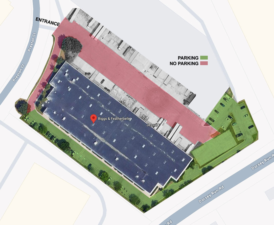 Use this handy map to find the best parking nearby. We have plenty of spots directly in front of our warehouse, but also down the lot and around the corner. Green areas are your best bet!