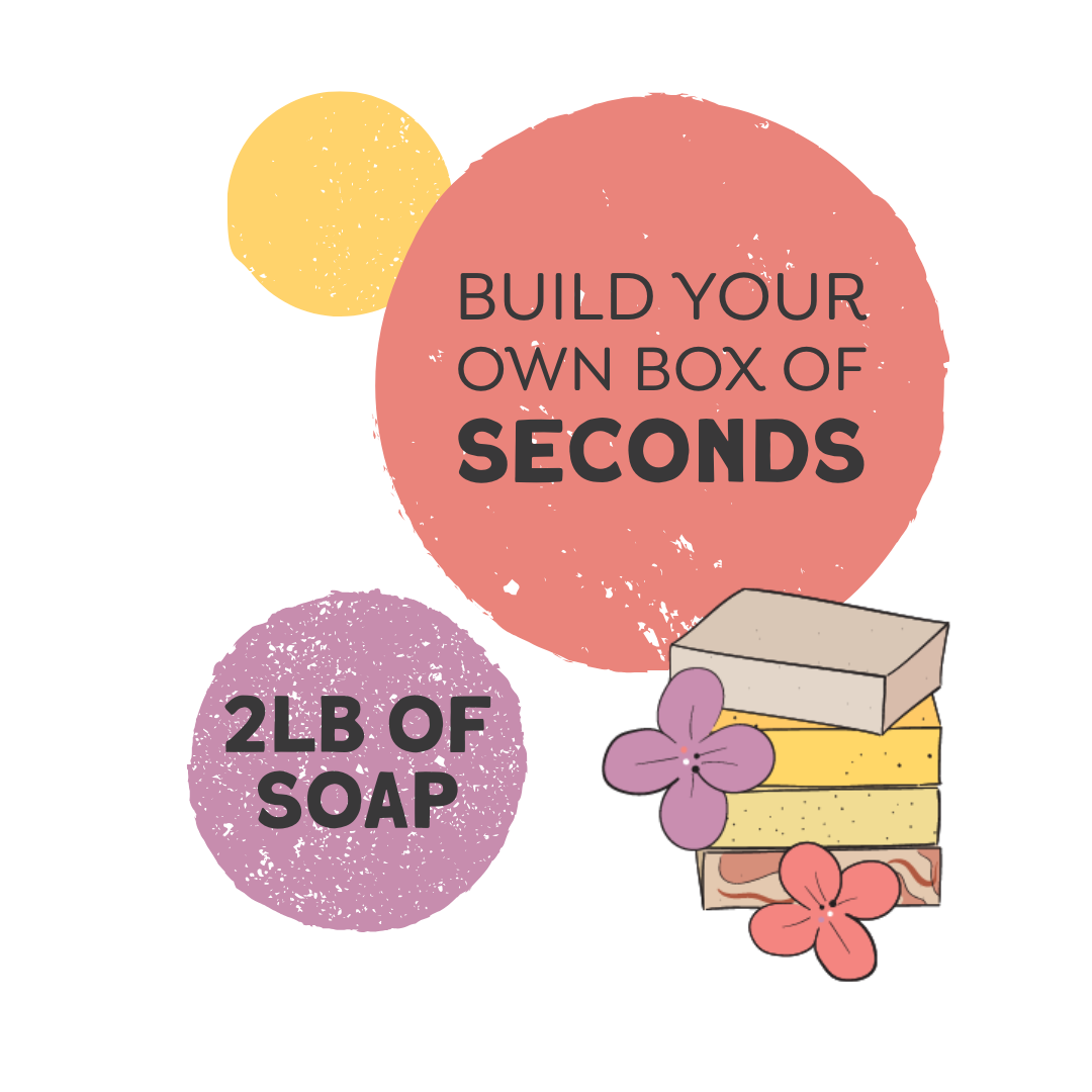 Mix and match your way to 2 pounds of handmade bar soap seconds. It’s a scrappy, sudsy deal packed with variety and value. Pick a fave or discover a new scent! No two boxes are the same, and that’s the fun of it.